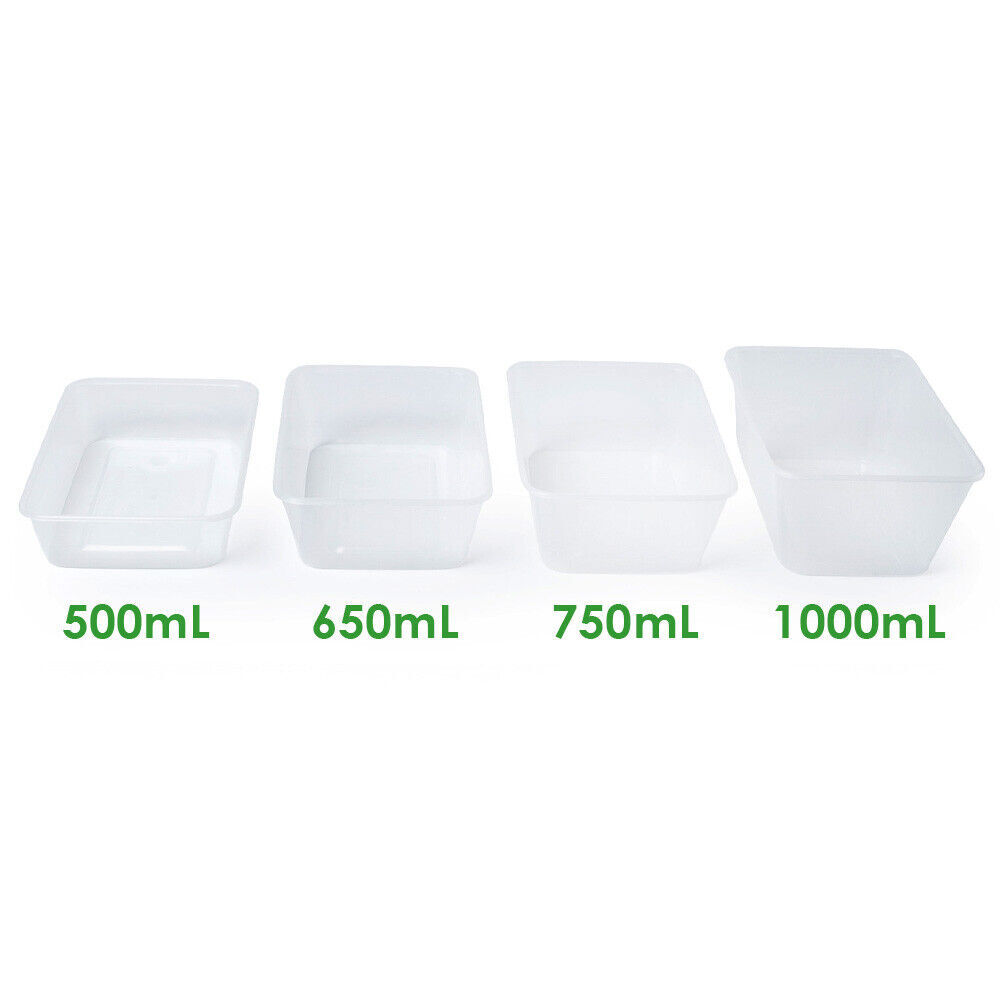 Plastic rectangle containers come in 4 sizes, 500ml/650ml/750ml/1000ml, unbeatable prices whether in 50packs or 500packs. BUY IN BULK AND SAVE!